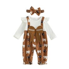 Get your little one game-day ready with this Baby Girls Fall Romper Football Print Jumpsuit. Designed with a charming football and bow print, this outfit combines comfort, cuteness, and seasonal style in one. The fake two-piece design gives it a stylish layered look, while the included matching headband completes the outfit perfectly. Whether it’s for playdates, family gatherings, or cheering on game day, your baby girl will be the star of the show.Features You’ll Love