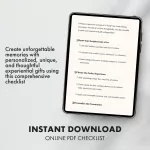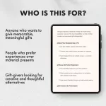 Unlike other generic gift guides, The Checklist for Giving Experiential Gifts That Actually Wow focuses on creating deeply personal and lasting experiences. This digital download walks you through every step, from understanding your recipient’s preferences to capturing the magic of the moment. It’s not just about the experience itself, but about how to craft it into a memory that will stay with your loved one forever. With practical tips and a fun, hands-on approach, you’ll be equipped to create a gift like no other!Key Benefits: