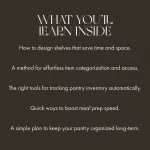 - Chapter 2: Planning Your Pantry Layout – Assess your space, categorize items by food group and frequency, and avoid planning pitfalls.