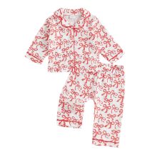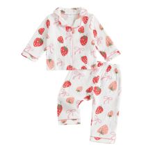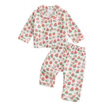 Wrap your little one in comfort and charm with this adorable Pajama Set for toddler girls. Designed for cozy nights and playful mornings, this two-piece sleepwear set features a button-up long sleeve top with a sweet lapel collar and a matching pair of soft pants. The delightful bow and strawberry prints bring a playful touch that your child will absolutely love. Whether it’s bedtime, lounging at home, or snuggling during storytime, this pajama set keeps your girl warm, comfy, and irresistibly cute.Product Features