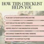 This checklist is perfect for busy parents, homeschool families, teachers, and caregivers who want to keep kids engaged outdoors in healthy, creative, and educational ways. It’s ideal for children ages 3–12 and can be used year-round in backyards, parks, or school playgrounds.