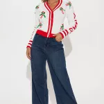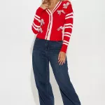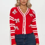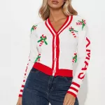 Step into the season with this adorable Y2K Christmas Knit Cardigan, designed for anyone who loves cute winter style with a touch of sparkle. Made from a soft, medium-weight polyester knit, this cardigan feels warm and comfortable without being bulky. Its loose-fitting pattern, full-length sleeves, and short 4–16 inch length create a flattering silhouette that pairs effortlessly with jeans, skirts, or your favorite holiday outfit. The standout feature is its charming candy-bow vibe and shimmering diamond-style decoration that adds just the right amount of holiday magic. With a square V-neckline and button-up front, it brings a playful yet polished look perfect for winter gatherings, fall layering, or festive celebrations. Whether you're dressing up for Christmas events, cozying up indoors, or simply embracing nostalgic Y2K fashion, this cardigan is your go-to piece for all seasons.Key Features