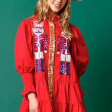 Step into the magic of the season with this stunning Women’s Christmas Sequin Nutcracker Mini Dress. Designed to bring holiday cheer wherever you go, this long-sleeve, glitter-accented shirt dress blends comfort, charm, and eye-catching shine. Its playful Nutcracker-inspired print and shimmering details make it an irresistible choice for festive gatherings, family photos, themed events, or simply adding sparkle to your seasonal wardrobe.Product Features