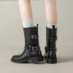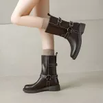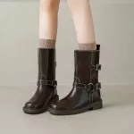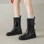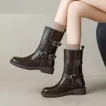Get ready for the colder months with these chic Winter Women’s Split Leather Mid-Calf Riding Boots. Designed for both style and practicality, these boots are the perfect addition to your wardrobe for autumn and winter. With their timeless design and sleek metallic details, they’ll complement any outfit, whether you're riding, walking, or simply enjoying a cozy day out. The mid-calf length provides the right amount of coverage, while the round toe and chunky heel offer comfort and support for all-day wear.Product Features:
