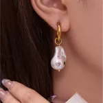 Discover the perfect accessory to transform any outfit with these stunning stainless steel hoop earrings. Featuring a delicate baroque imitation pearl pendant and finished with 18K gold plating, these earrings are designed to capture attention and exude sophistication. Their graceful dangle adds movement and charm, making them an ideal choice for women who love to express elegance and style effortlessly. These earrings are crafted from high-quality stainless steel, ensuring durability and long-lasting shine. The gold plating adds a luxurious touch without the high price, while the lightweight design guarantees comfortable wear all day or night. Perfect for both casual outings and formal events, they are versatile enough to complement every wardrobe.Product Features