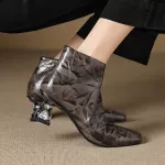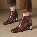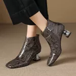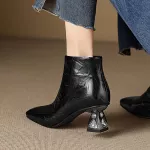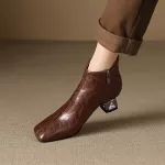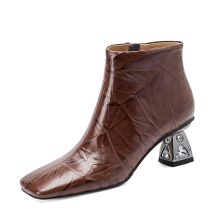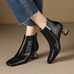 These ankle boots are a must-have for every fashion-forward woman this winter. With their striking strange heel design and square toe, they provide a sophisticated yet bold look that will turn heads wherever you go. The genuine leather material ensures that the boots remain a timeless addition to your wardrobe, while the sheepskin insole keeps your feet comfortable even during longer outings. Not just for winter, these boots are versatile enough to pair with dresses, skirts, jeans, or leggings. Their modern zipper closure makes them easy to put on and take off, while the rubber outsole gives you the stability and traction needed for a day out on any surface.Perfect for Any Occasion