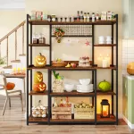 This bakers rack features a 5-tier design with different-sized sections and a sturdy metal grid, giving you plenty of options to store everything from spice bottles and pots to plates and kitchen utensils. Additionally, 11 S-shaped hooks provide convenient hanging space for cooking tools, oven mitts, or small kitchen gadgets, keeping everything within easy reach. Its thoughtful layout ensures that no matter what appliances or kitchenware you own, you will always have a spot for them.Durable and Stylish Construction