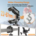 - Secure Clamp: Adjustable clamp width from 22mm to 87mm for a firm grip on both flat and round surfaces.