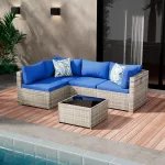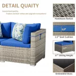 Elevate your outdoor living with the All-Weather Grey 5-Piece Outdoor Wicker Sectional Sofa Set, complete with a glass coffee table and plush blue cushions. Whether you're hosting a barbecue, enjoying a sunny day, or relaxing with a good book, this modern, versatile furniture set is perfect for any occasion. The sleek grey finish combined with the vibrant blue cushions adds a touch of style to your garden, patio, or poolside area.Key Features: