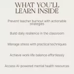 Being a teacher is a rewarding but demanding profession. It’s easy to forget your own wellbeing while juggling lesson plans, student needs, and administrative tasks. That's where Mental Health Strategies Every Teacher Needs comes in. This comprehensive eBook is designed to help educators recognize the importance of mental health for teachers and provide actionable strategies to prevent burnout and build resilience. It’s the ultimate guide for teachers who want to thrive, not just survive, in the classroom. Inside, you’ll find a range of powerful mental health strategies to improve your overall wellbeing. From managing stress to fostering a supportive school environment, this eBook covers it all. You’ll gain valuable insights on how to balance your work and personal life, recognize early signs of burnout, and tap into AI-powered resources for mental health support. Designed specifically for educators, this guide offers a practical roadmap to achieving long-term mental health and wellness.Key Features and Contents:
