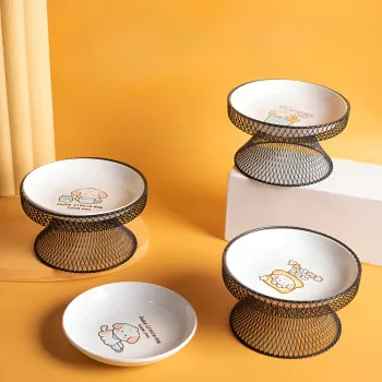 Ceramic Cartoon Cat Bowl with Iron Stand – Cute & Sturdy Pet Feeder