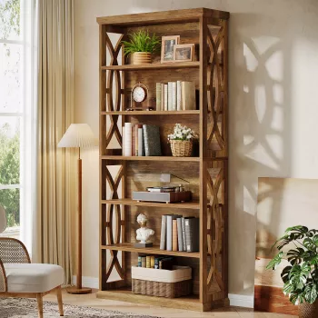 6-Tier Freestanding Industrial Bookcase - Large Wooden Bookshelf with Storage Shelves