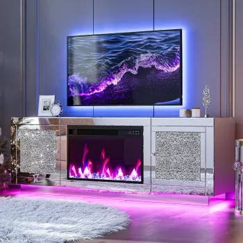 Mirrored Fireplace TV Stand with Crushed Diamond & LED Lights for 65+ Inch TVs