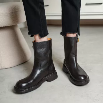 Women’s Mid-Calf Genuine Leather Motorcycle Boots with Square Heel