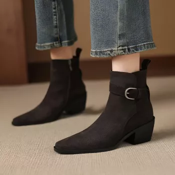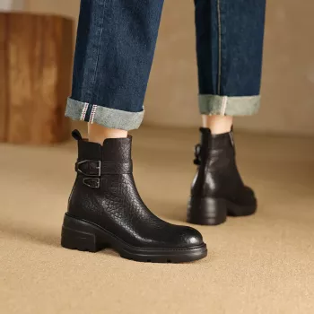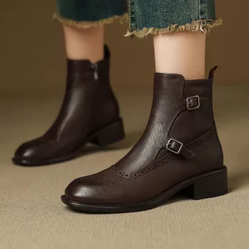 Women's Buckle Chelsea Boots – Handmade Genuine Leather, Round Toe, Low Heel Ankle Boots
