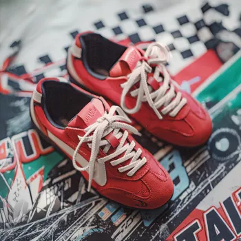 Vintage Red Patchwork Racing Sneakers for Women – Breathable Low-Top Trainers