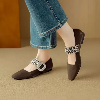 Square Toe Mary Jane Pumps with Low Heel & Rhinestone Buckle