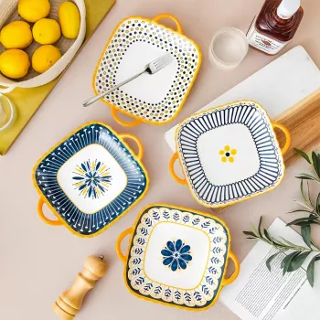 Japanese Style Square Ceramic Plates with Double Handles
