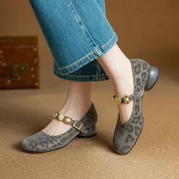 Square Toe Cow Pattern Mary Jane Pumps with Low Heel