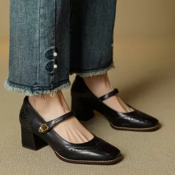 Spring Women’s Square Toe Low Heel Pumps with Buckle Strap – Suede Leather Mary Janes