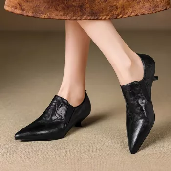 Elegant Leather Slip-On Pumps for Women - Pointed Toe Kitten Heel Shoes