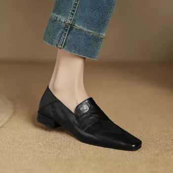Spring Women Loafers Genuine Leather Square Toe Low Heel Slip-On Pumps